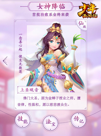 上圣观音原画与背景故事预览作为仙族金将,上圣观音能为阵容中的仙族提供大量攻击力与伤害加成。同时,她还可为敌方神将附加“悲咒”效果,从而达到牵制敌方怒气恢复的目的。