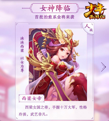 西梁女帝原画与背景故事预览人族治愈系金色神将是西梁女帝,当她上阵后可开启“魂殇”属性,每当我方有神将阵亡时,人族神将都将获得命中与免伤加成。同时,西梁女帝还可为我方全体神将附加抵伤护甲,并使敌方血量最低的两名神将附加“情殇”状态,处于该状态的神将血量回复时转化为等量伤害。