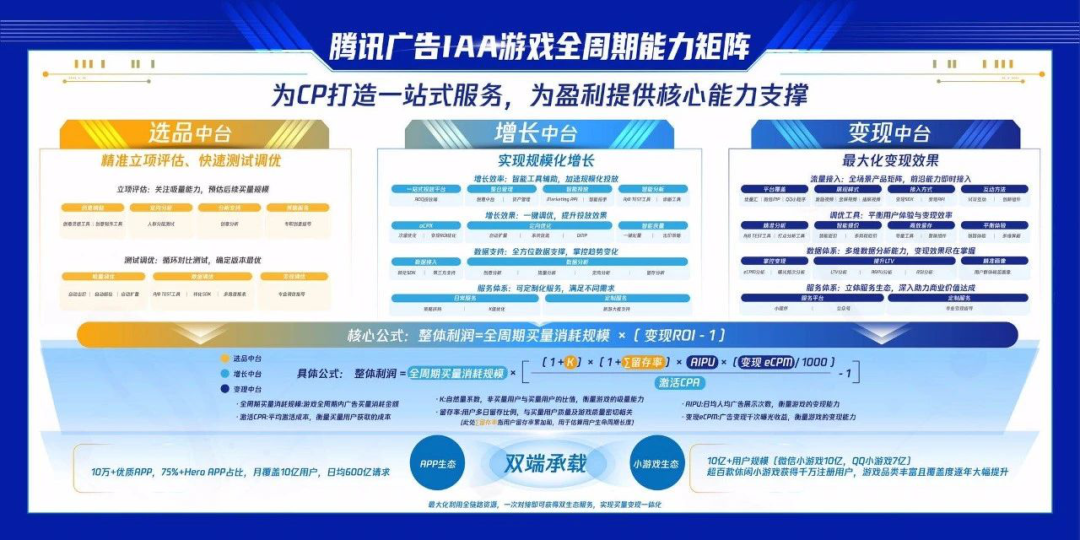 这三大中台,涵盖了产品能力、服务能力,让CP可以在腾讯广告实现增长有方法、能力有依托,让CP和腾讯广告能够共建规模化创新。一系列中台服务助力CP在各个阶段降低门槛,提升效率,优化效果,最终以APP、小游戏双端百亿曝光数据量,承载CP产品成功。