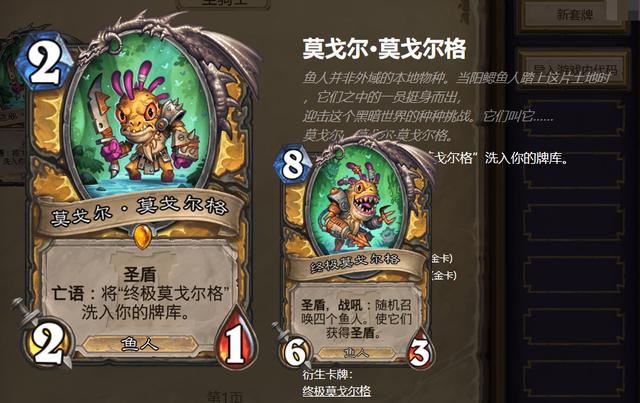 而榜首则是鱼人骑的核心卡莫戈尔,这张卡强势的地方也是后面的终极莫戈尔格,只要能拿到手中,就能用单卡打出超强的铺场效果,并且还都有圣盾,对手可能想解都解不了,那它就能在关键的时候决定比赛的胜负了。