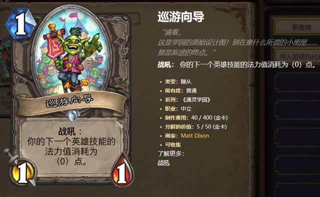 既然是图腾萨,那肯定图腾就是召唤得越多越好了,萨满的英雄技能是2费召唤1个图腾,看上去有点亏,但有时候也不得不用,而巡游向导的出现就可以节约很多费用了,相当于是1费召唤一个11再加一个图腾,无论是前期用来站场还是后面用来和其他卡配合都是非常不错的。