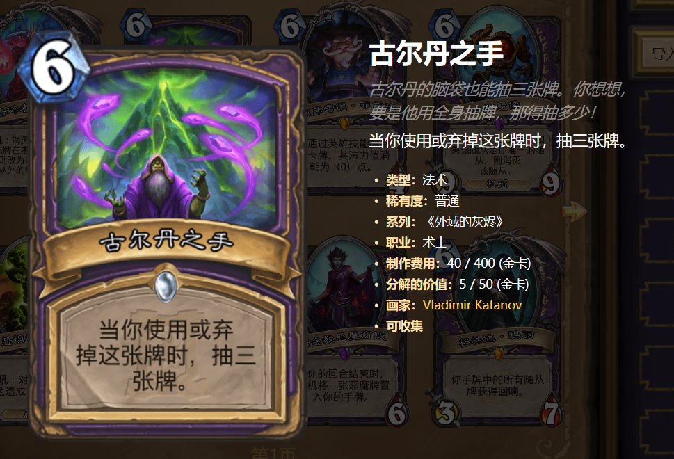 快攻卡组最怕的还是手牌资源的短缺,而这套弃牌术更是如此了,毕竟过程中还要弃掉不少,但古尔丹之手的存在就能大大的弥补这点,本身他的费用就是最高的,可以被一些卡稳定的弃出去,那就相当于免费抽3张卡了,由于这张卡一般也是不会打出去的,只要留在手上,就算是随机弃也很可能弃到他,那就能再发动一次攻势了,对手往往都招架不住。