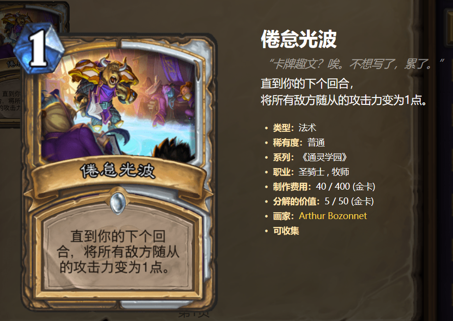 先来说说倦怠光波,这张卡的效果比较强大,虽然只有1回合的生效期,但在这一回合内起到的作用可不少,一是可以大大降低敌人的输出,二是把敌人的攻击降低后可以配合自己的一些卡把对方的大哥拿过来,这样就很可能改变场上的局势啊。
