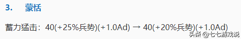 蒙恬的蓄力猛击兵势伤害被削。蒙恬这个英雄目前在对局中强度还可以,伤害虽然很高,但是因为自身不太灵活,很容易被一些秀的英雄秀死。