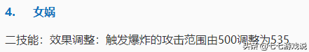 女娲的二技能爆炸范围增加。女娲目前属于下水道英雄,在对局中几乎都看不见。女娲这个英雄看起来不秀,但想玩得好还是挺难的,遇到对面有女娲的对局还是蛮恶心的。