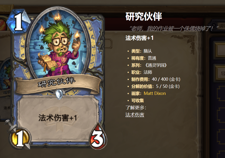 113的随从在1费中也算身材很不错的了,而研究伙伴还附带了一个法术伤害+1的特效,既可以在各种配合中用来提供伤害,也能在前期提供一个站场的作用,对面不得不解,可以让卡组的整体节奏放缓,也更容易到我们开始发力的时候。