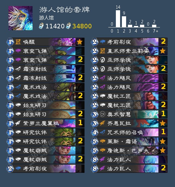 可以看到卡组中带了大量的低费法术,还有很多获得低费法术的牌,他们和巫师学徒,齐恩瓦拉,法力飓风等卡都有不错的配合效果,还能让法力巨人很快以低费入场,自然就很容易取得场上节奏了。