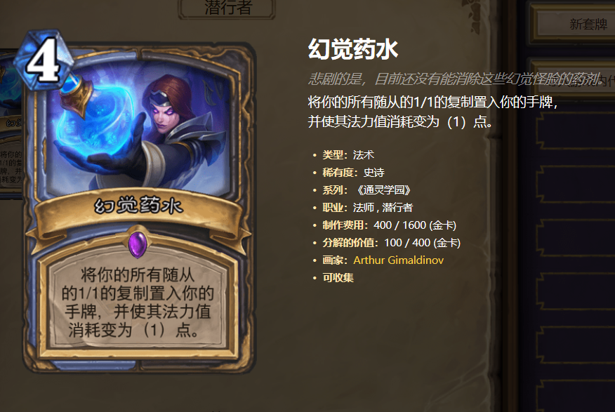 幻觉药水在这套卡组中也会起到锦上添花的作用,因为大部分卡都有很强的特效和配合能力,把他们变成1费的11无疑是很划得来的,同时也可以回收一些关键卡,本来只能打一次的超强组合就能再来一次,对场面的帮助肯定是非常高的,一次打不死再来一次的话对手就抗不住了。