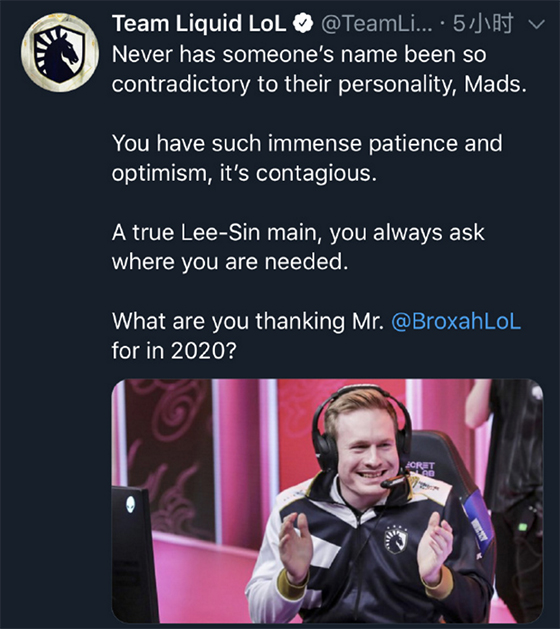TL官推正文大意:谢谢大家2020年的支持,虽然我们在小组赛阶段被淘汰,但是对于队伍取得的巨大进步我们感到非常自豪,从今年北美春季赛的苦苦挣扎到这周肉眼可见的转变,我们虽然没有得到我们想要的结果,但是我们尽了最大的努力。