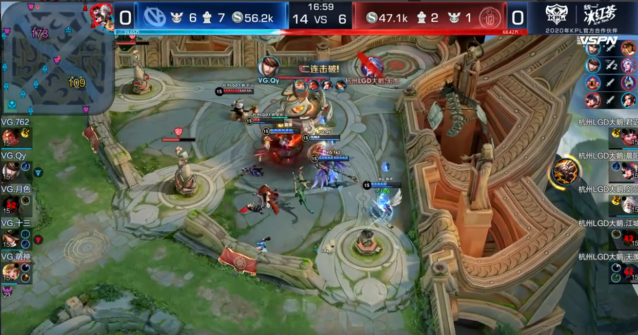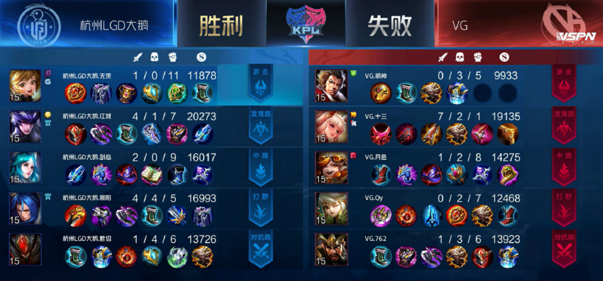 第5局,LGD大鹅采用的周瑜为核心的推进体系,效果不错,很快就破掉不少防御塔,VG则在一波团战获胜后拿到主宰,反攻破掉对手的中路高地,又再次拿到主宰后破掉上路高地,绝境下,LGD大鹅觉醒了,周瑜闪现反吹天秀配合队友连拿人头,在拿到风暴龙王后一波推掉对手水晶,让2追3成功,比赛也是非常精彩啊。