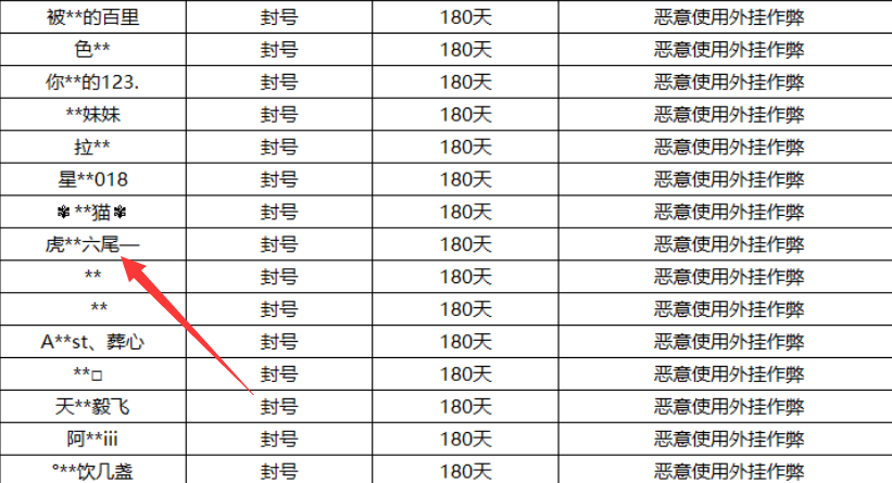 大家可以看到在这次的封号名单中有一个叫虎**六尾一的人,虽然屏蔽了几个字,但关键的六尾两个字还在,并且是恶意使用外挂作弊被封的,于是有人就觉得这个作弊的人会不会是用百里守约用得非常好的主播六尾啊,毕竟他的百里守约打得非常准,怀疑他是挂也是很正常的。