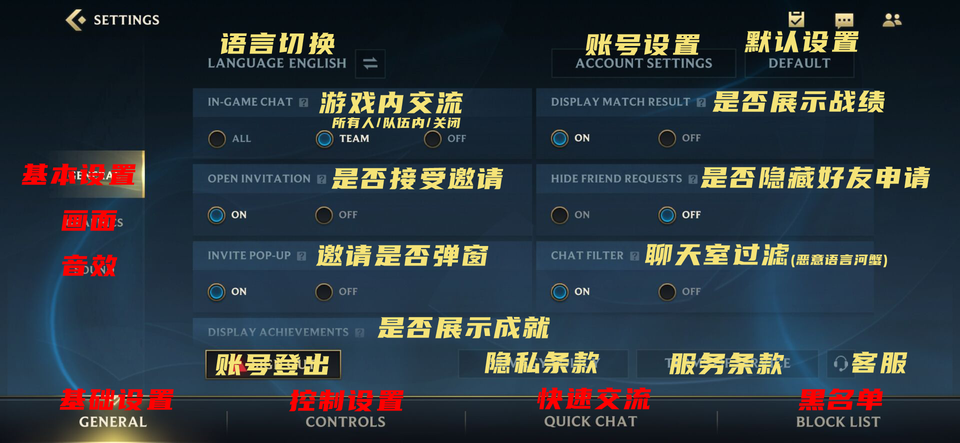 LOL手游设置界面翻译:基本设置/画面/音效/功能与快捷语音