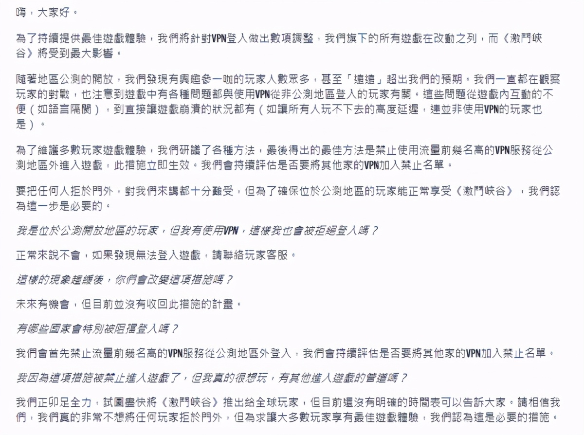 官方称,将玩家拒之门外对他们也是“十分难受”的,但为了确保公测地区玩家的正常体验,因此认为有必要采取这一措施。
