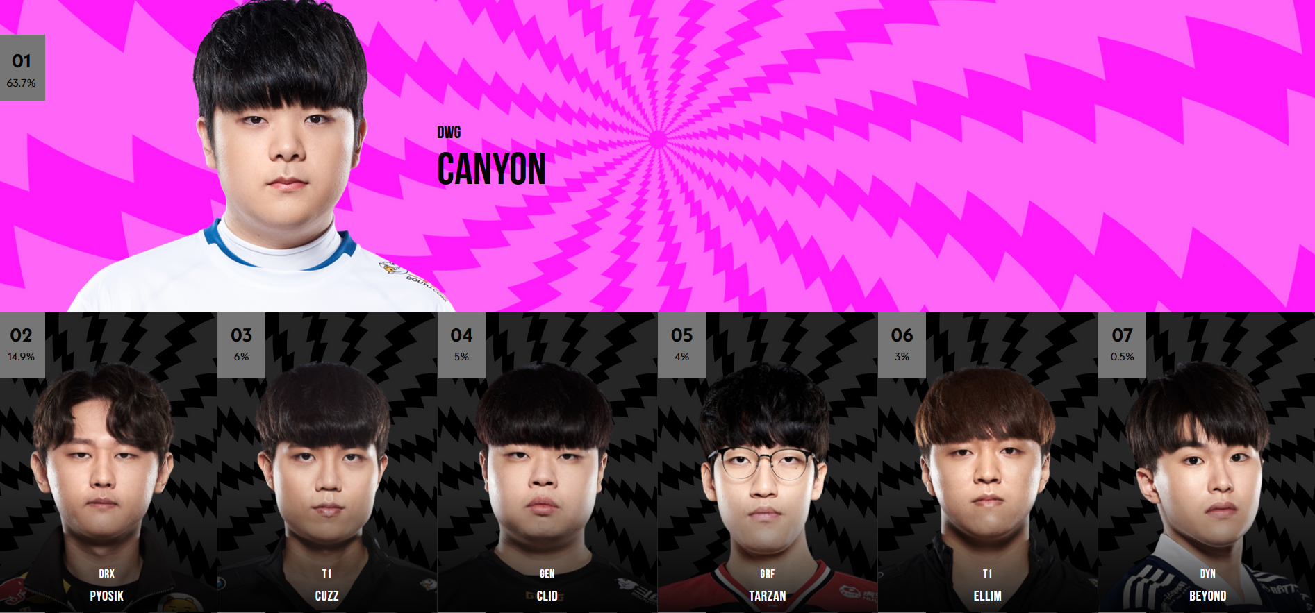 中路位置T1 Faker依旧是榜首,而对于今年世界冠军的DWG Showmaker以26.5%的票数暂居第二。