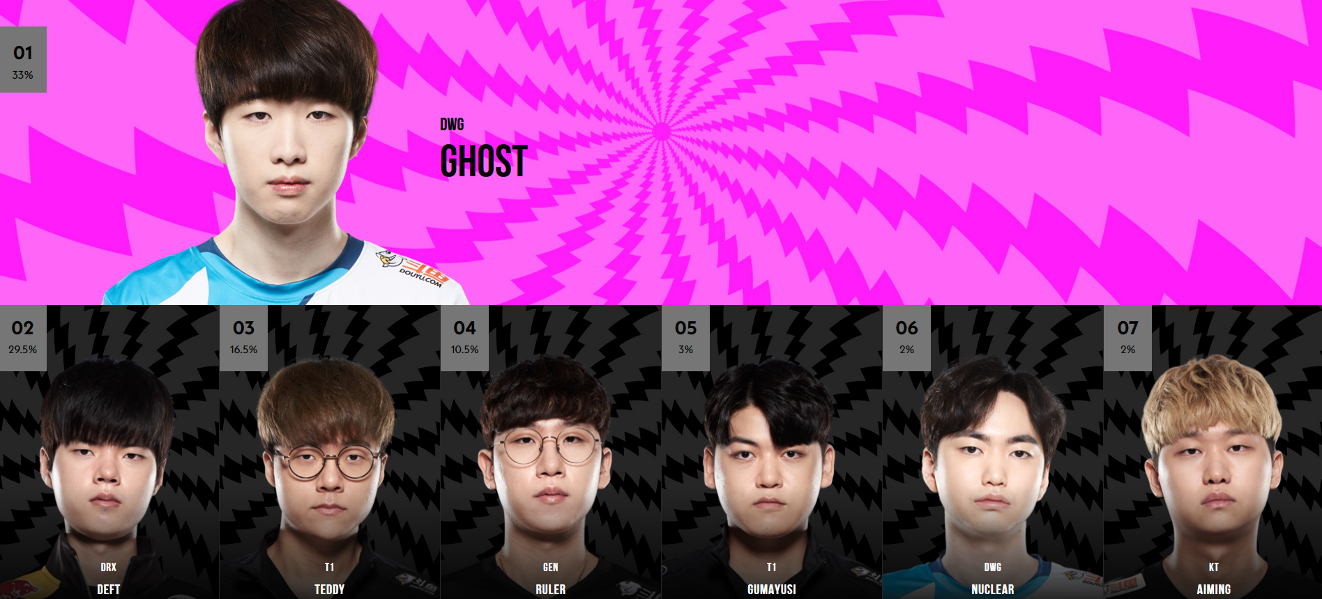 下路位置中,DWG下路Ghost得票第一,第二是Deft,票数相差较少。