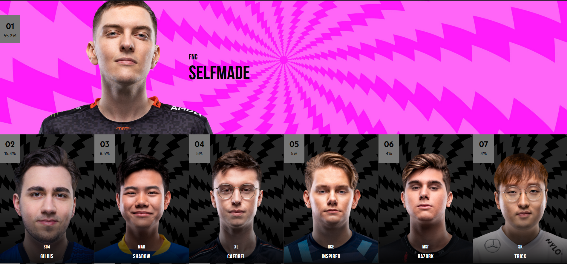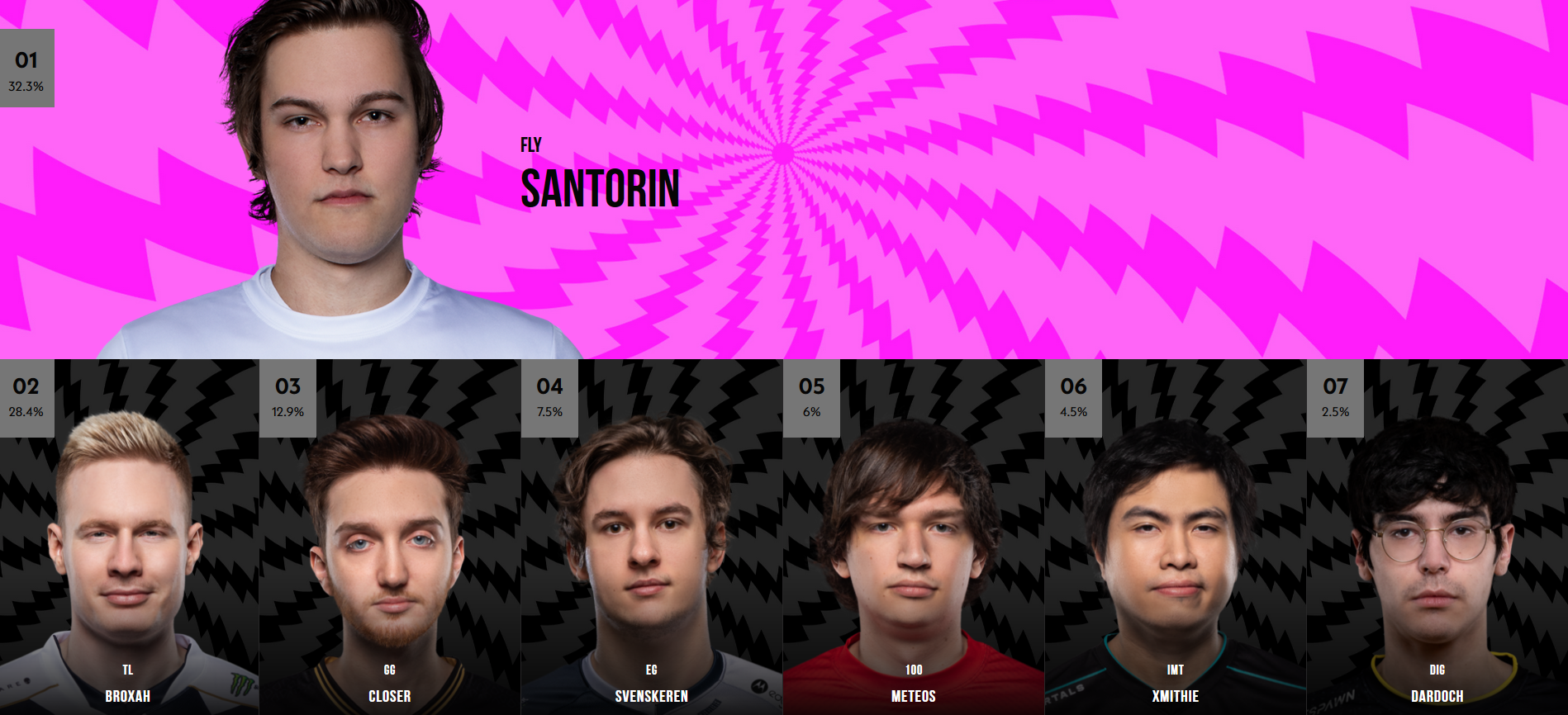 打野位FLY的Santorin与TL的Broxah以大票数差距领先于其他选手。