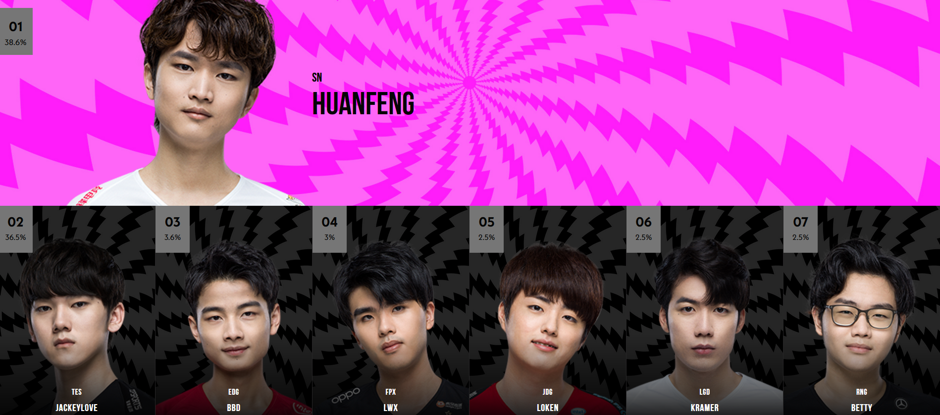 下路huanfeng第一,而JackeyLove第二,两人票数大幅度领先其余下路,不过JackeyLove与huanfeng票数非常接近,huangfeng随时有被超过的可能。