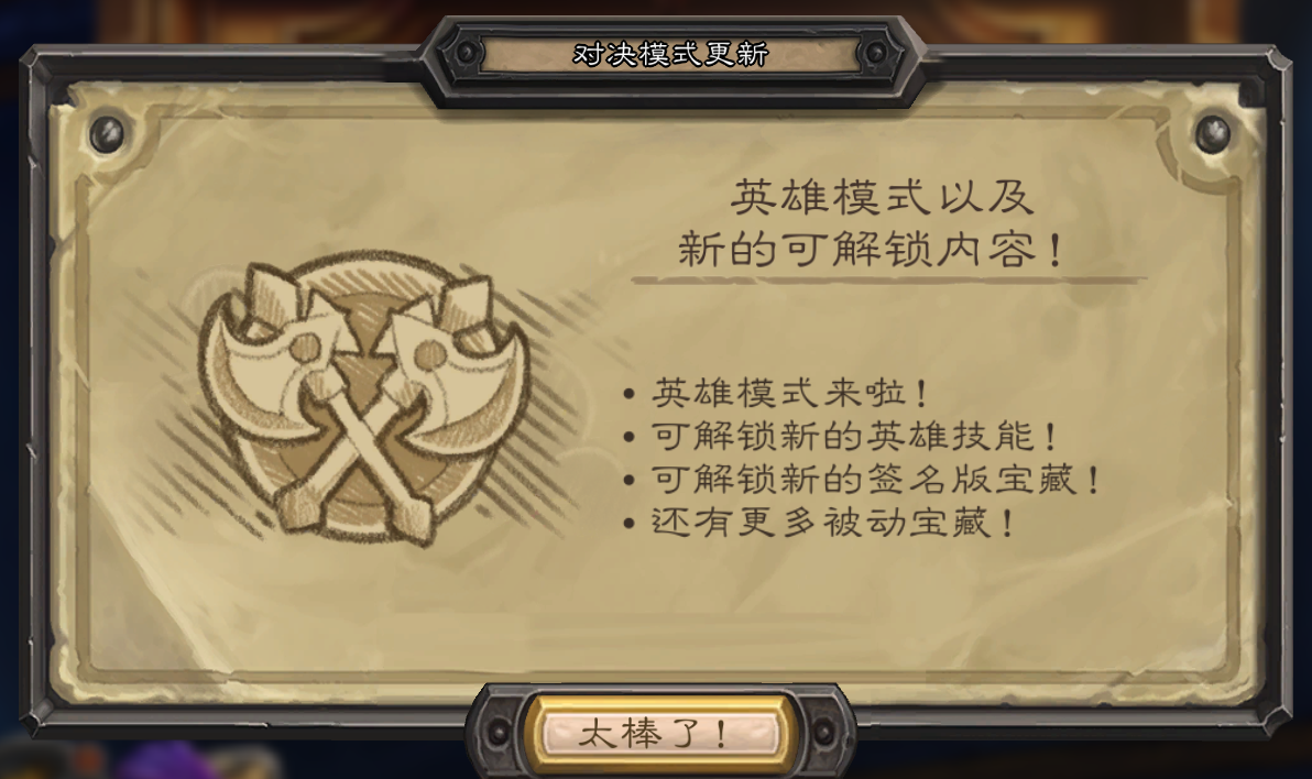 首先由于新扩展包疯狂的暗月马戏团的到来,只有凑够了足够的卡牌就可以解锁新的英雄技能和签名版宝藏,大家的打法自然也会更多,在被动宝藏和主动宝藏的加成下,还有各种天马行空的配合,乐趣度肯定是更高一些的,不过英雄模式要进入的话,需要一张旅店通票,这点和竞技场一样,当然赢得高胜的话奖励也是蛮丰富的。
