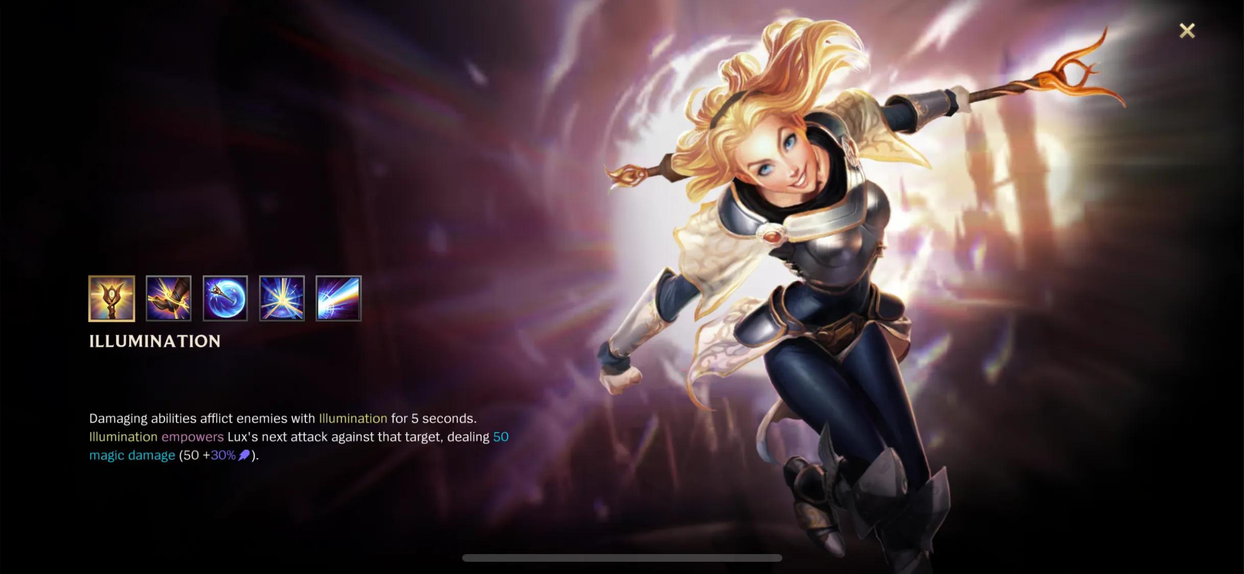 在積蓄能量之後,拉克絲發射一道光束,對區域內所有敵方目標造成傷害。此外,此技能將觸發拉克絲的被動技能並刷新光芒四射減益效果的持續時間。