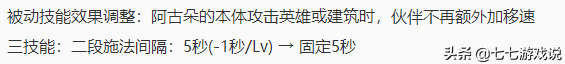 阿古朵被动本体攻击英雄或者建筑时,小伙伴不再额外加移速,大招二段施法间隔变成固定5秒。因为阿古朵的一些技能机制,有时候都没办法反制,还是挺恶心的,这次就调弱了阿古朵的强度。