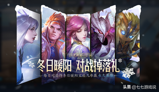 为期一周的活动时间,在峡谷对局有机会获得冬日暖阳宝箱,胜率2个,失败1个,每日上限3个。打开这个宝箱有机会获得永久英雄,不过更多的可能还是铭文、钻石或者体验卡。有机会获得的永久英雄有:镜、孙策、伽罗、干将莫邪、鬼谷子。