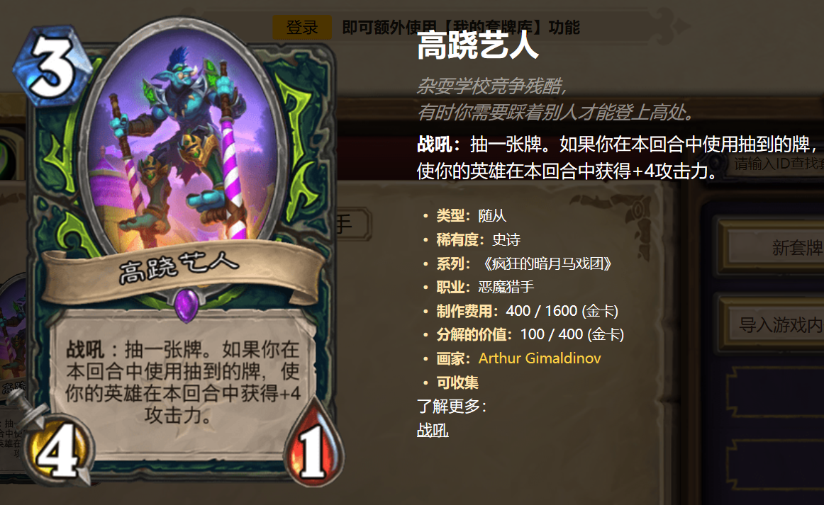 再来看看新扩展包中的几张关键卡,高跷艺人本身341的身材看上去不是很好,虽然攻击高但很容易被敌人解掉,输出就打不出来了,但它本身可以抽一张卡,并且只要在6费及以上使用,那抽到的牌就肯定可以使用,英雄也能多4点输出了,这4点输出是实打实的,相当于3费站一个41随从再加4点伤害再加过一张牌,性价比真的太高。