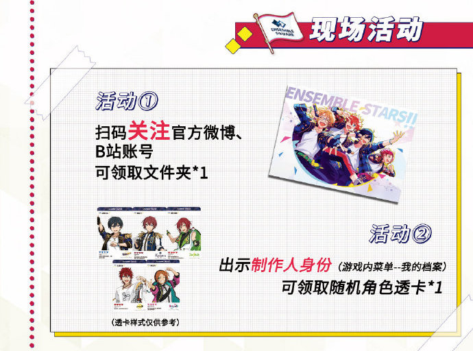 漫展期间,关注《偶像梦幻祭2》官方微博@偶像梦幻祭2、B站@偶像梦幻祭2助理君,即可获得定制文件夹*1。同时,现场点击游戏内菜单-我的档案,向工作人员出示制作人身份,即可获得随机角色透卡*1。