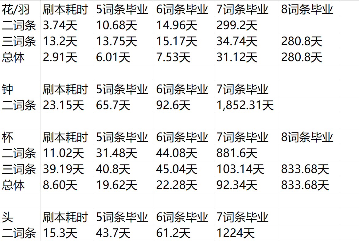 所以,表中的时间,难以给你一个准确的结论,说’你刷65.7天圣遗物本,肯定给你一个毕业钟。