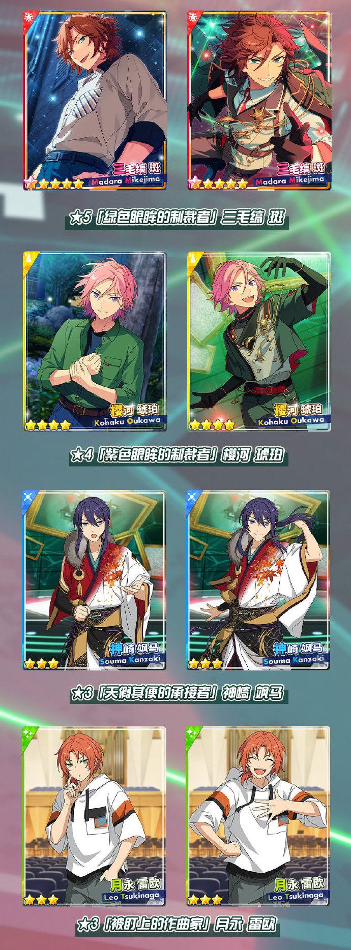 本期登场卡片为★5【绿色眼眸的制裁者】三毛缟斑、★4【紫色眼眸的制裁者】樱河琥珀、★3【天假其便的承接者】神崎飒马、★3【被盯上的作曲家】月永雷欧,这四张限定卡牌将在活动中与大家见面了,此次演唱会活动奖励卡片均附有MV服装及特殊演出。