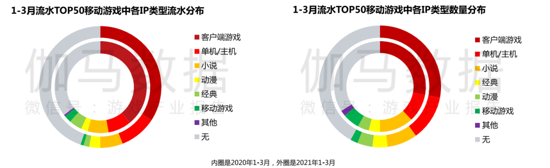 若按游戏IP分布来看,2021年Q1,单机/主机IP改编的移动游戏无论是数量还是流水均有所增长,这主要得益于《使命召唤手游》和《天地劫:幽城再临》两款产品。而无IP游戏产品期内流水份额和数量占比也超4成。