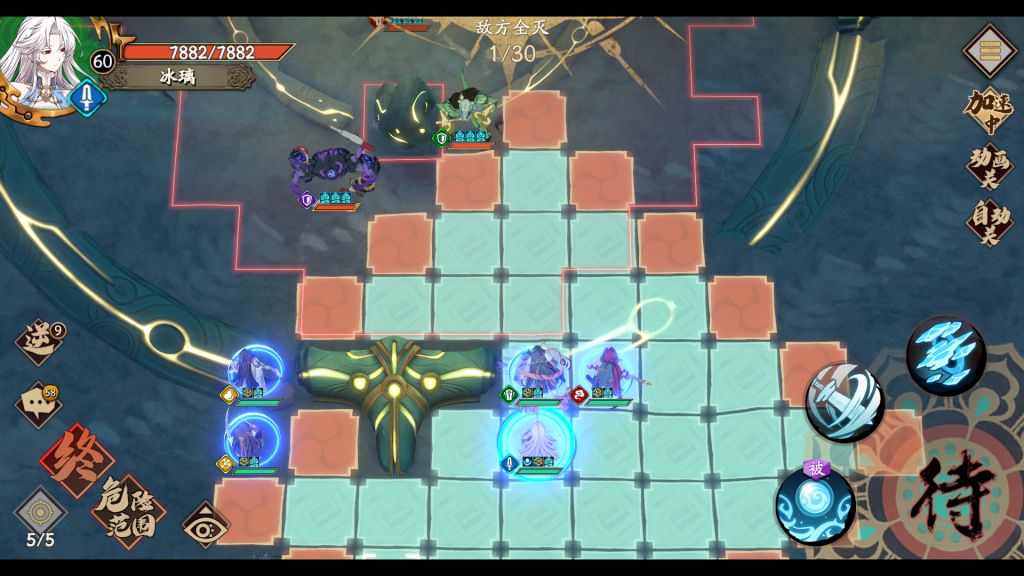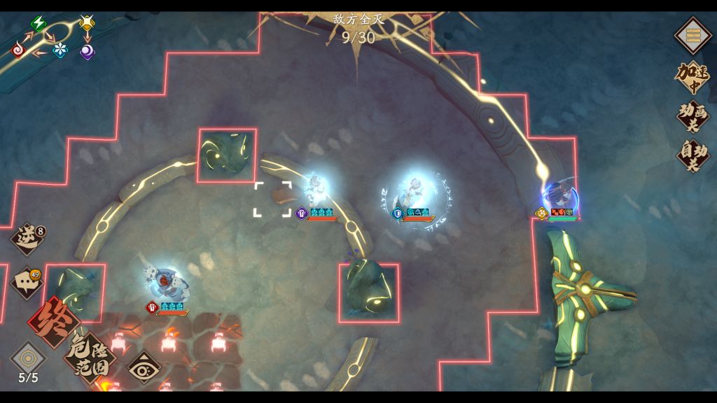 门口小怪比较简单,就简单叙述一下流程: 曹沁标记火法,大招砍死雷盾,走到火法的射程范围最外一格,冰璃紫枫站危险范围外。