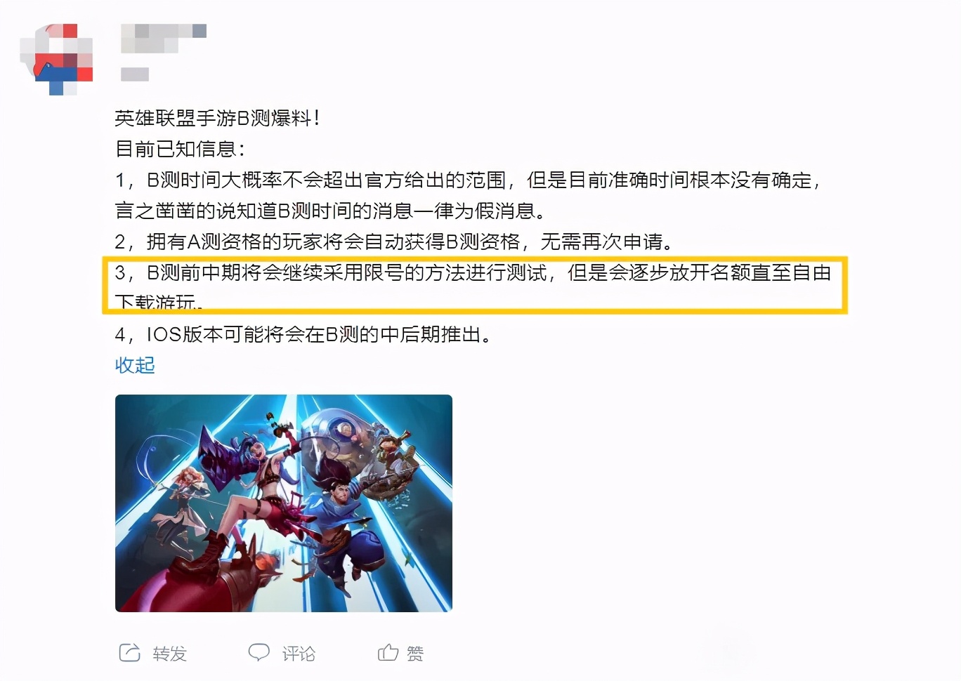 因为英雄联盟手游b测主要测试的内容是关于最大在线服务器人数,而关于游戏之类的一些稳定性,和一些不平衡性漏洞,是在a测当中已经解决。所以英雄联盟手游b测将会呈现一个循序渐进的过程,也就是起初参与内测的人数,可能没有太多,因为官方也是怕服务器承受不了太多的人,但是会随着慢慢的测试,名额也会进一步的开发,直到英雄联盟手游b测全面开放为止。