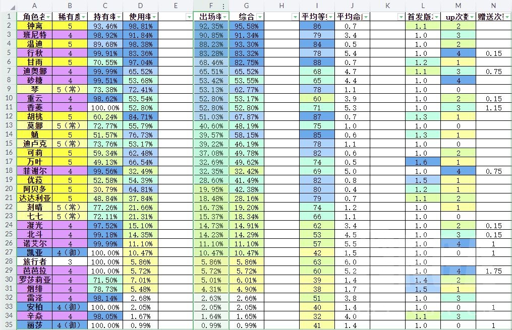 这个数据其实也有些参考价值,与使用率的主要区别在于限定五星部分,虽然抽五星受人气等因素影响,但和强度也有不小的关系。