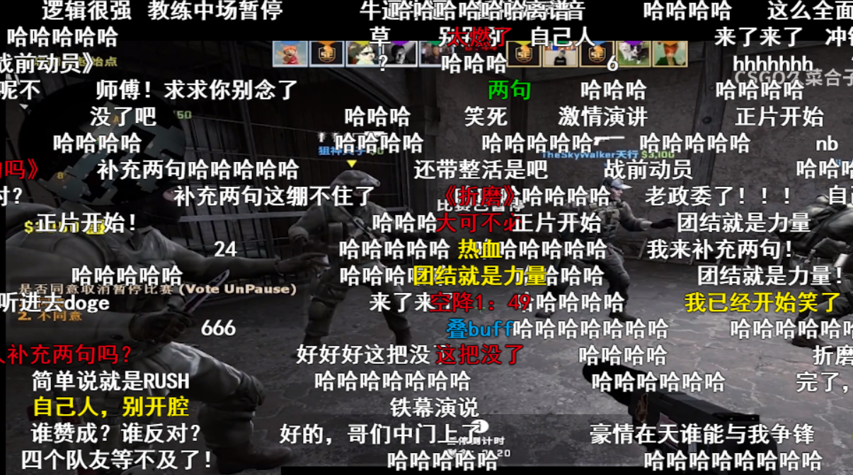 而这段时间也是有一件很有意思的事,那就是大家在比赛激烈的时候都会暂停一下,来讲两句和比赛相关的话,一是指出队伍打法的一些问题,同时来鼓舞一下大家的士气,而说到讲两句这个流行的梗则是出自B站的CSGO主播王喜顺,他经典的做法就是暂停后讲两句套路,最终再一首《武林风》把大家折服,让看比赛的小伙伴也是其乐融融。
