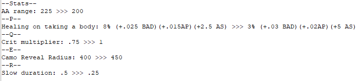 拾取敌方英雄灵魂时,获得的基于该英雄最大生命值百分比治疗效果的百分比由8(+0.025额外攻击力)(+0.015AP)(+2.5攻击速度)%调整为3(+0.03额外攻击力)(+0.02AP)(+5攻击速度)%。