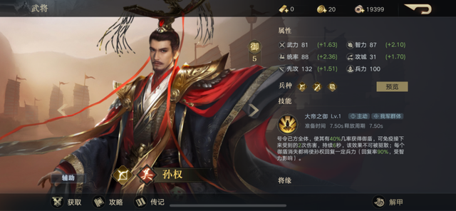 第四个,孙权。孙权这个橙卡武将,和曹操很相似,因为也是辅助定位,同样的可以作为团队核心。孙权的技能“大帝之御“,能够让孙权统领全体并且能够有一定概率获得护盾,免疫接下来的两次伤害,而且这个效果不能被驱散,护盾消失后还会让自身回复一定兵力,强度上虽然不及同为辅助的曹操,但是依然是十分强势的辅助卡片。
