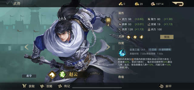 第一个,赵云。赵云,众所周知是武力极强的角色,在游戏中的武力设定值也比较高,在这款游戏中则是充分还原了其“七进七出”的作战能力。赵云在游戏中,可以说将攻击和防御完美结合,而且作为游戏中比较容易获取的橙卡,可以在前期快速完成开荒,而赵云的技能输出也很容易搭配,注重升级武力值就可以有非常出色的表现。