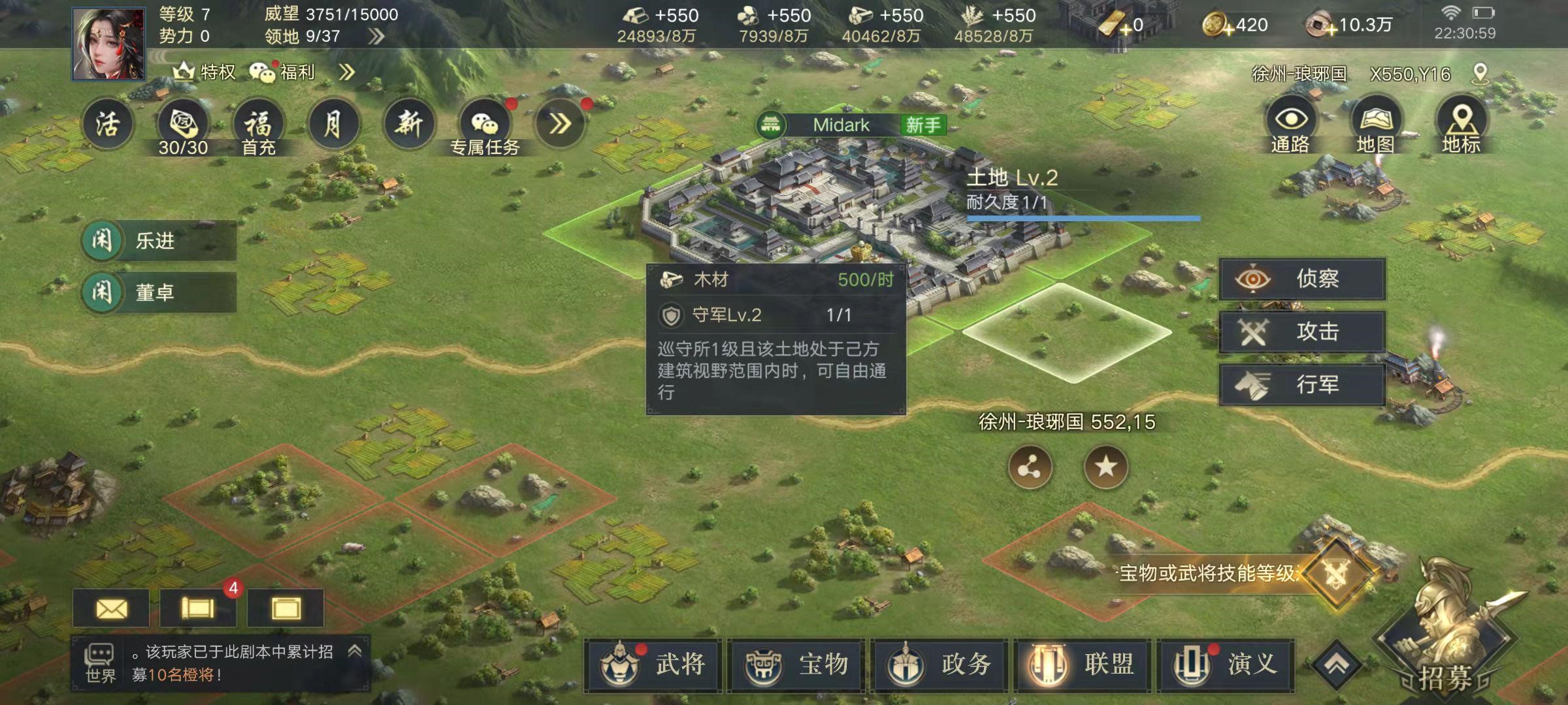 有了武将之后,就可以考虑攻城掠地,扩张势力了。由于《荣耀新三国》采用了创新的通路机制,因此除了收割资源之外,占领土地的另外一个最大的用处,就是方便玩家建立自己的交通网,以后可以更加快速的向目标位置行军。需要注意一点的是,在游戏中只有1级土地和7级官道可以直接通过,而其他的资源点如果想要前往的话,玩家就必须占领附近的土地,开辟出一条可以行军的通路。