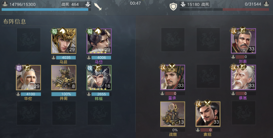 由于摆放合理,虽然第二波是魏国的弓骑队,王越被弓将集火惨死,但其他武将的战损并不是很多。所以,像这样的标准摆放站位,各位也是可以多多考虑和借鉴的。