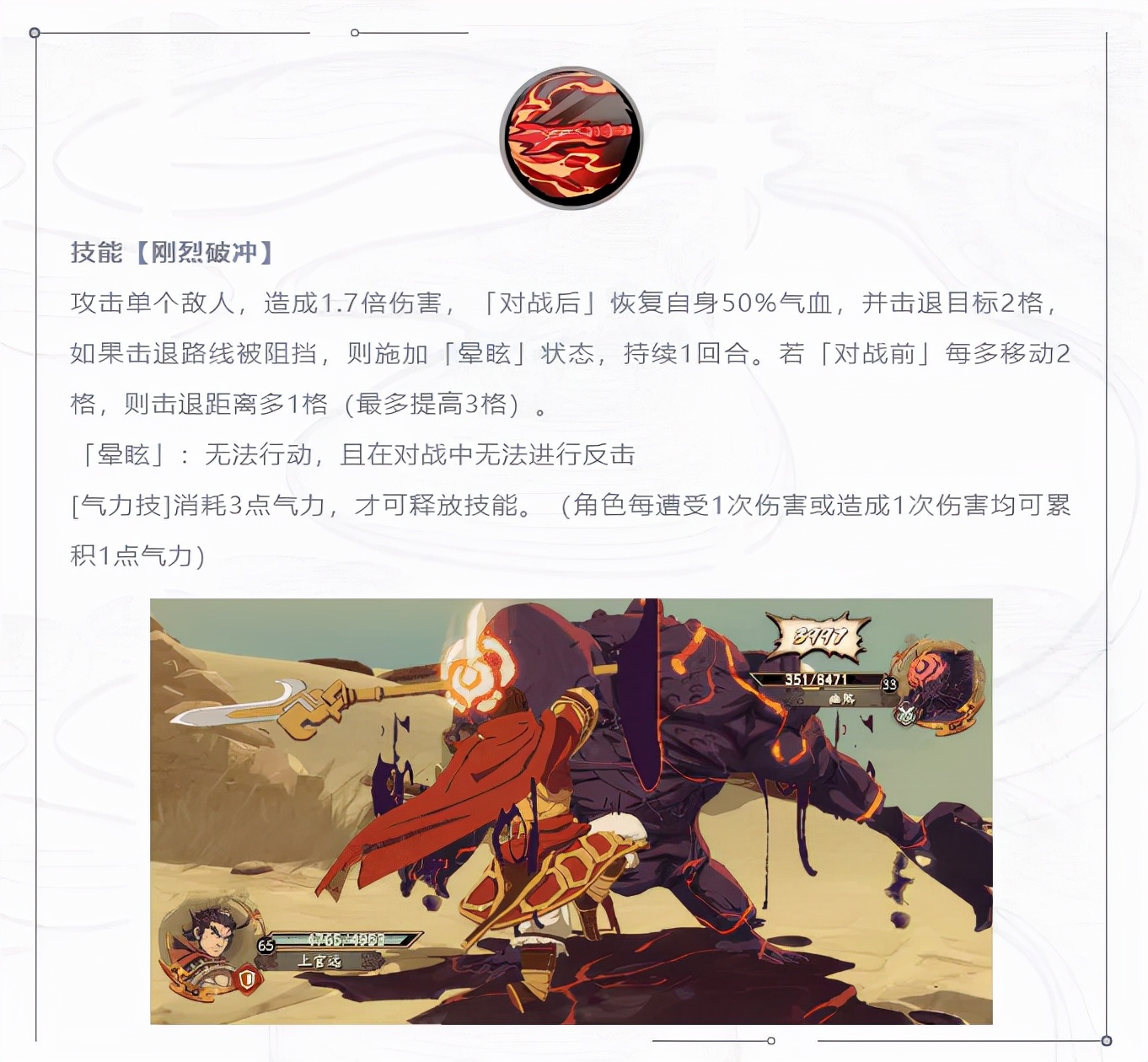 接着上官远的第三个专属技能是【刚烈破冲】,果然是一个把刚烈破升了级的大招技能,不仅需要3的气力才能释放,还借鉴了古伦德的天赋和【轰雷斩】的效果击退眩晕效果,不过【刚烈破冲】是一个单体输出类技能罢了,因此对于眩晕的敌人个数可能会略有不足。