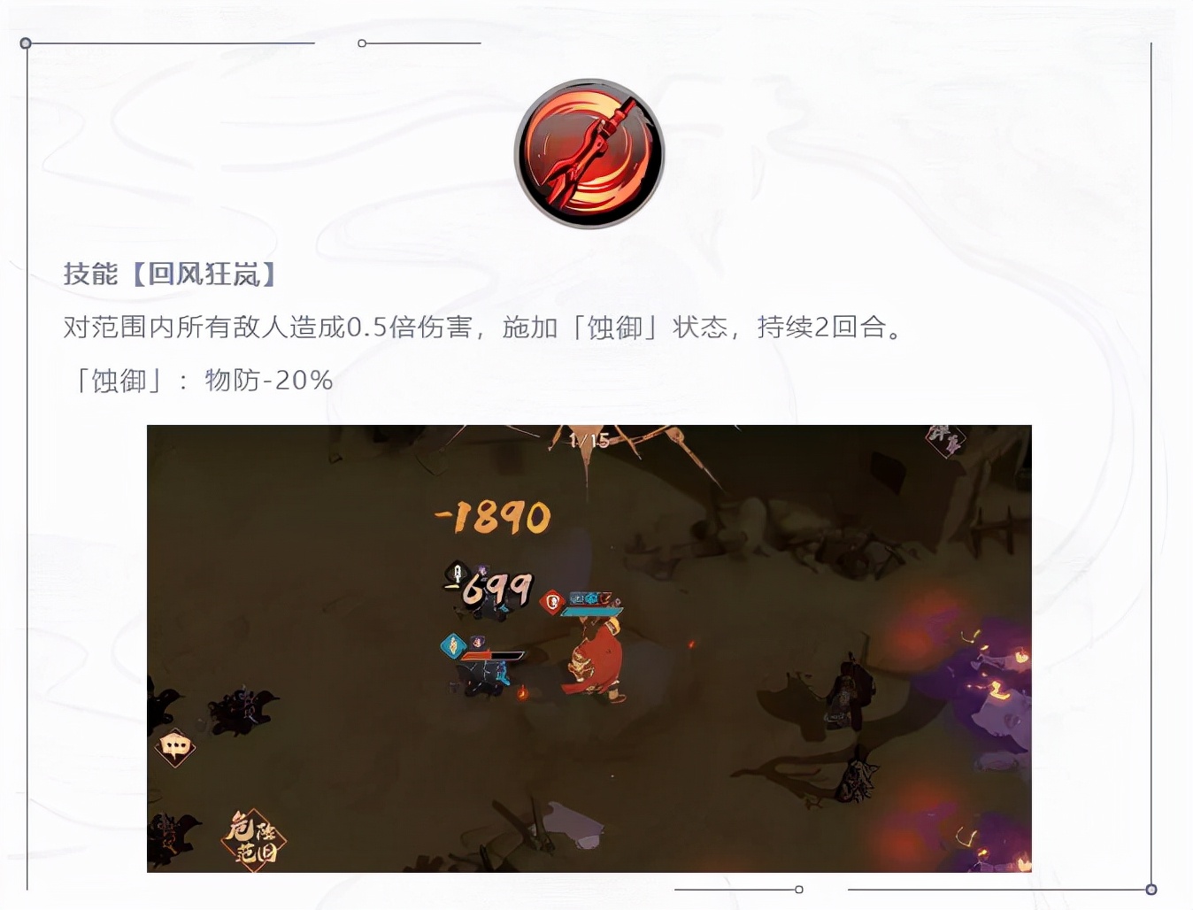 上官远的第一个天赋技能是【回风狂岚】,这应该是一个以上官远自身为核心可以释放的2格菱形范围的群攻技能,造成0.5倍的伤害还能施加持续2回合的物防-20%的效果,这个技能最大的意义不在其本身,而是可以帮助上官远快速积累2层【冲阵】状态,达到提升移动力、伤害、免伤比例和大招需要的气力。