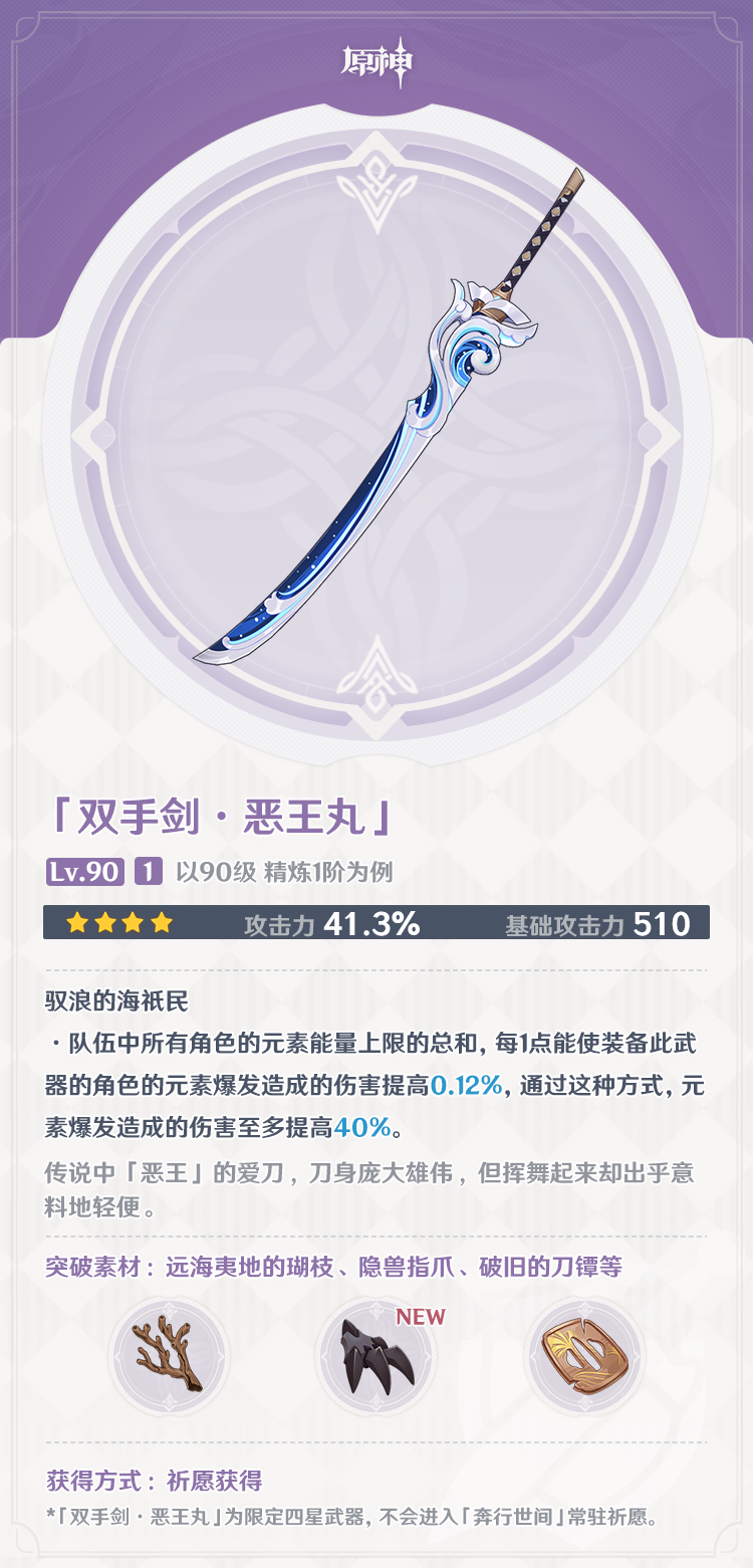 池子的新四星双手剑恶王丸的属性也很不错,属于锦上添花的存在,总的来说武器池质量很高,对于队伍里有弓箭和法器主C的旅行者建议抽取!