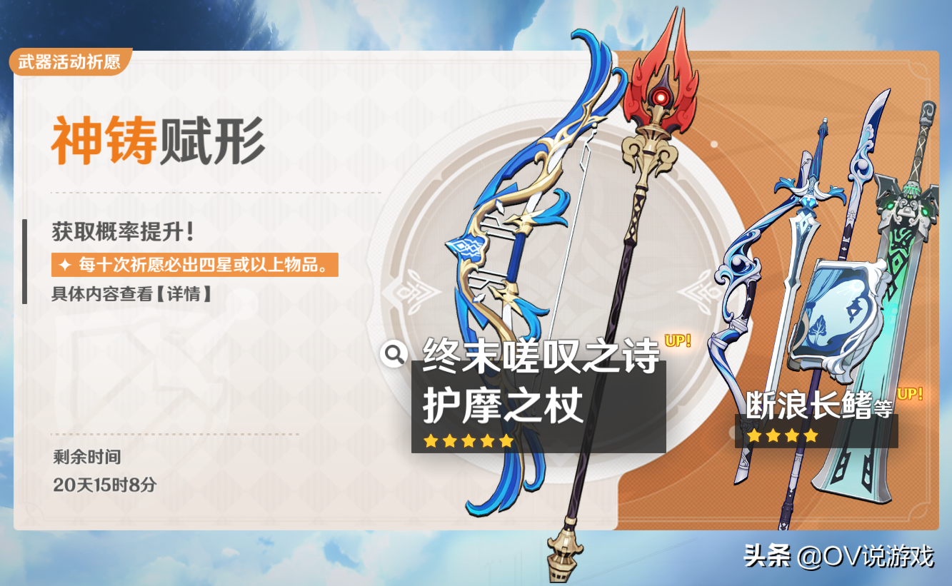 - 二是,这次UP期间不但有胡桃,还有托马这个非常不错的4星新角色,就连武器池的两把5星武器也是“护摩之杖和终末嗟叹之诗”这两把。就这池子内容,从微氪往上一直到土豪肯定都有动力冲一下的;