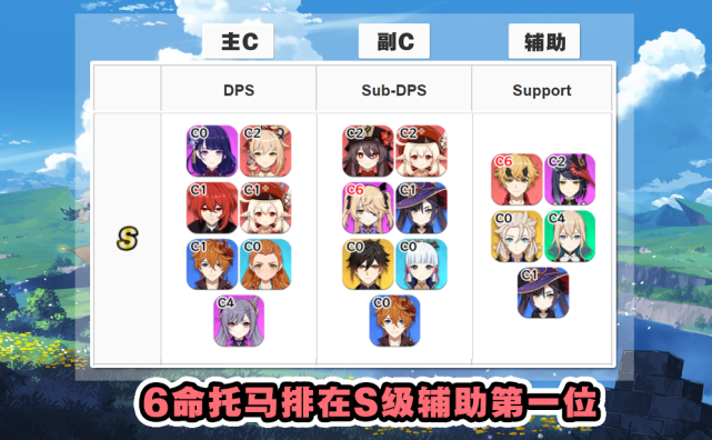 然后是S级角色,主C方面依旧被五星角色占据,包括雷神、宵宫、卢姥爷、可莉、公子、埃洛伊和刻晴,埃洛伊虽然是免费角色,但是她的强度一直被低估,其实完全可以使用。副C方面基本上也都是五星角色,只有6命菲谢尔成功上榜,排在S级副C第三名。辅助方面,新角色托马排在第一名,但是需要达到6命,因为6命可以为队友的普攻、重击和下落攻击增加伤害,大幅度提升辅助效果,2命九条裟罗排在托马后面一名,她是雷神的专属辅助,强度也很高。