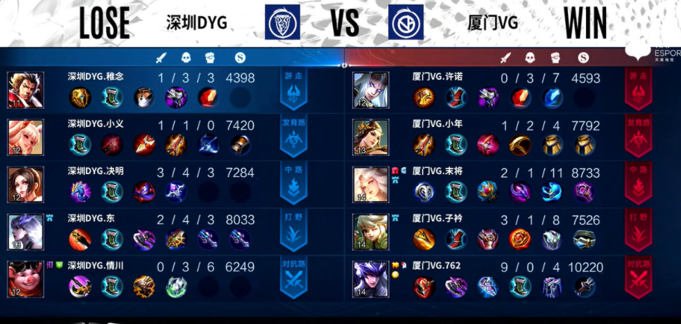 王者荣耀KPL职业联赛持续进行中,这几天是更加激烈的卡位赛阶段,尤其是A/B组之间的卡位赛更为惨烈,毕竟哪支战队输掉的话就和这个赛季直接拜拜了,所以各大战队都是拿出了自己的全部本事,我们就来看看深圳DYG和厦门VG之间的战斗吧。