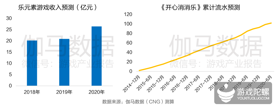 乐元素目前的游戏业务聚焦在亚洲市场,旗下《开心消消乐》从2014年上线至今,累积流水或超100亿元。伽马数据测算,2020年乐元素的游戏收入将超25亿元。《开心消消乐》游戏流水占国内消除移动游戏类市场份额的53.7%。