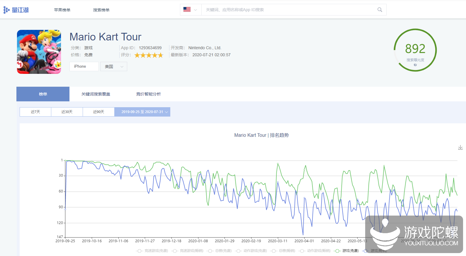根据量江湖监测到的美国区AppStore关键热词榜,“mario kart”在游戏类热词中排行第3,仅落后于“clash of clans”以及“wood turning”。在巨大的热度背后,一方面是任天堂在其家用游戏机Switch发售之初推出了《马里奥赛车8豪华版》(截至2020年3月底,该作销量达2477万套),而众所周知,美国是家用游戏机的主要市场之一;另一方面,任天堂基于“马里奥赛车”IP在移动端推出了《Mario Kart Tour》,该作在2019年9月底上架AppStore后便引发热潮: