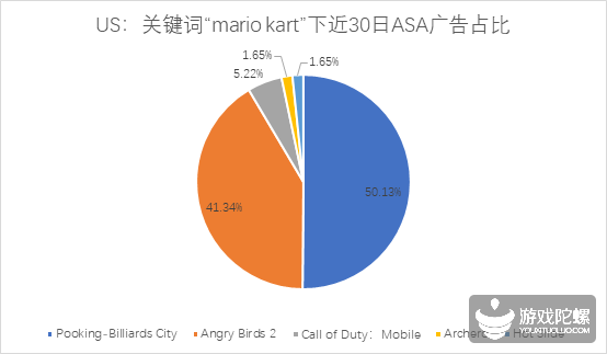 在热度最高的主要关键词“mario kart”下,《Pooking-Billiards City》成功拿下近30日的最多广告占比,高达50.13%,也就是说,近30日该关键词的所有搜索中,有一半以上的ASA广告展示量属于《Pooking-Billiards City》,最大限度地为产品获得了展示和流量。此外,紧随其后的是芬兰知名作品《Angry Birds2》(41.34%)和《Call of Duty:Mobile》(5.22%),值得注意的是,除了排名第2和第3的两款知名产品外,另外一个国产手游出海标杆产品《弓箭传说》(Archero)也在尝试通过竞价关键词“mario kart”来获量。