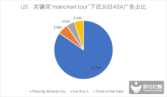 如上图,在美国区AppStore近30日的关键词“mario kart tour”搜索中,有84.69%的广告展示被《Pooking-Billiards City》拿到,获取了绝大部分潜在的流量。