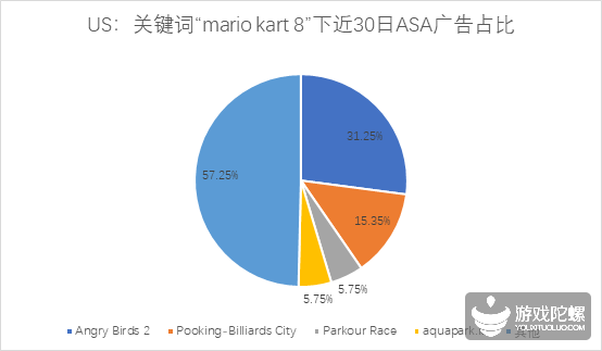 如图,在关键词“mario kart 8”下,《Pooking-Billards City》排在《Angry Birds 2》之后,拿到了15.35%的广告展示,虽然在该词下并未拿到最多的广告展示占比,但考虑到该词下流量被大量产品瓜分的状况,其15.35%的广告展示也颇为可观。